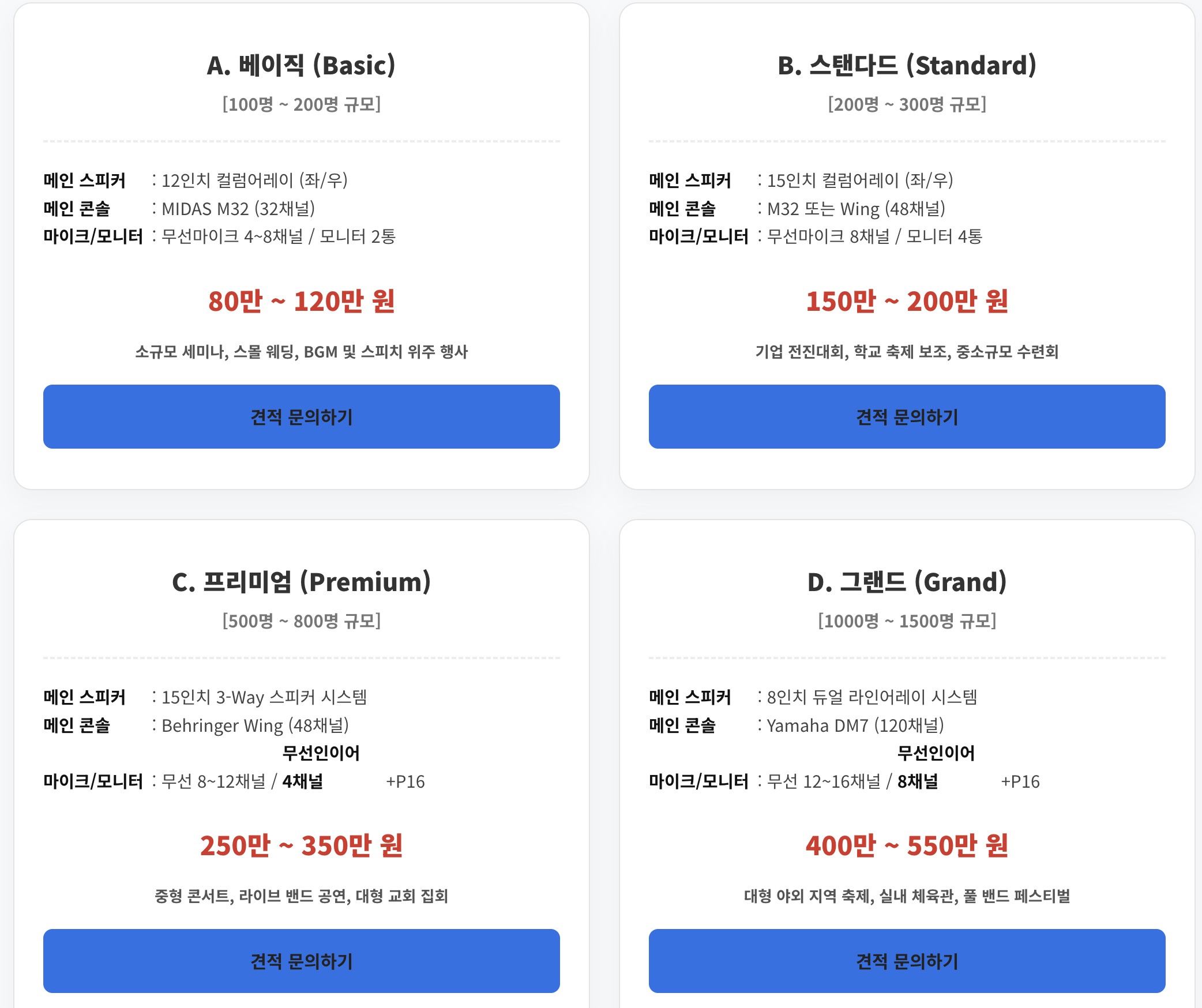 우리는 단순한 장비 대여를 넘어, 행사의 성격과 규모, 공간 특성에 맞춘 맞춤형 음향 솔루션을 제공합니다.