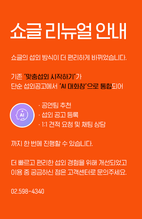 AI 매니저가 가장 적합한 팀을 빠르게 추천하고, 전담 매니저가 끝까지 케어하는 프리미엄 매칭 서비스를 경험하세요. 맞춤섭외 시작하기 > 행사의뢰 견적받기 > 공연팀 MC 연예인 결혼식/돌잔치 시스템 렌탈 인력 제작물/프로그램/음식 지역별검색 누적 섭외 19,768 건 등록된 전문가 공연팀 2,713 팀 연예인 1,001 팀 시스템 349 팀 섭외된 전문가 : 36팀 ABOUT 쇼글 서비스 이용안내 투명한 개런티 기본금액 및 실섭외가 조회 자세히 보기 견적 비교 여러 아티스트 견적을 한번에! 자세히 보기 1:1 견적 원하는 아티스트에게 바로 견적문의 자세히 보기 직접 소통 아티스트와 직접 채팅을 통해 협의 자세히 보기 안심 결제 직거래 피해 NO! 자세히 보기 CONTACT 혹시~ 힘들고 어렵나요? 쇼글 매니저가 도와 드릴게요! PHONE 매니저에게 직접 통화로 문의하기 02-598-4340 KAKAO 쇼글 매니저와 카톡 상담하기 상담톡 바로가기 무엇을 도와드릴까요? 공지사항 FAQ